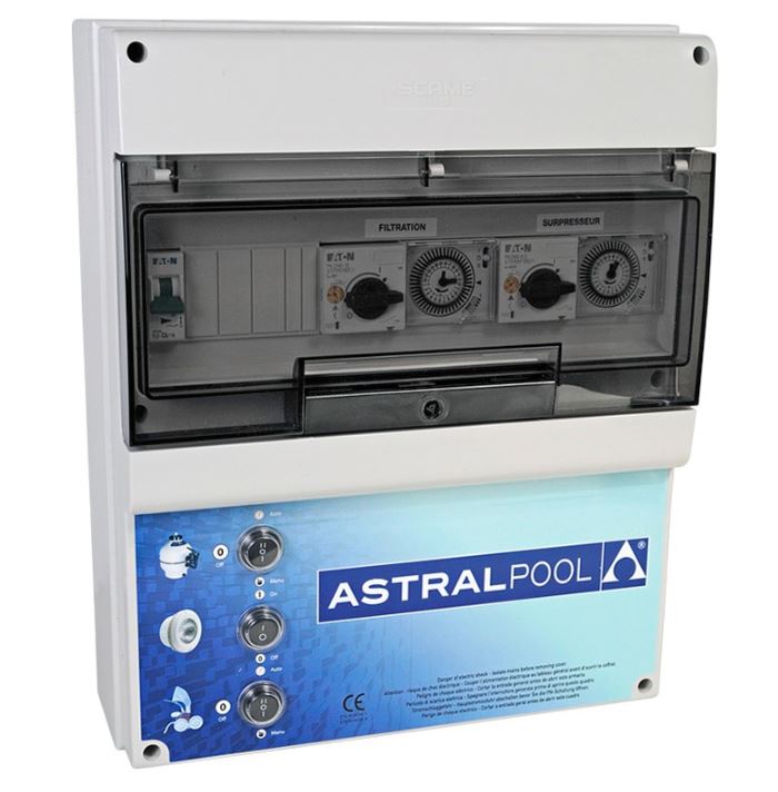 - TIPO C + TIPO D: Protección magnetotérmica (2 bombas de 1,6 hasta 10 A) contactor, reloj programación 24 h. Tres posiciones: autor/O/manual. 230 V 10 A. salida protegida para luces. 12 V 315 VA salida protegida para 1 luz subacuática.