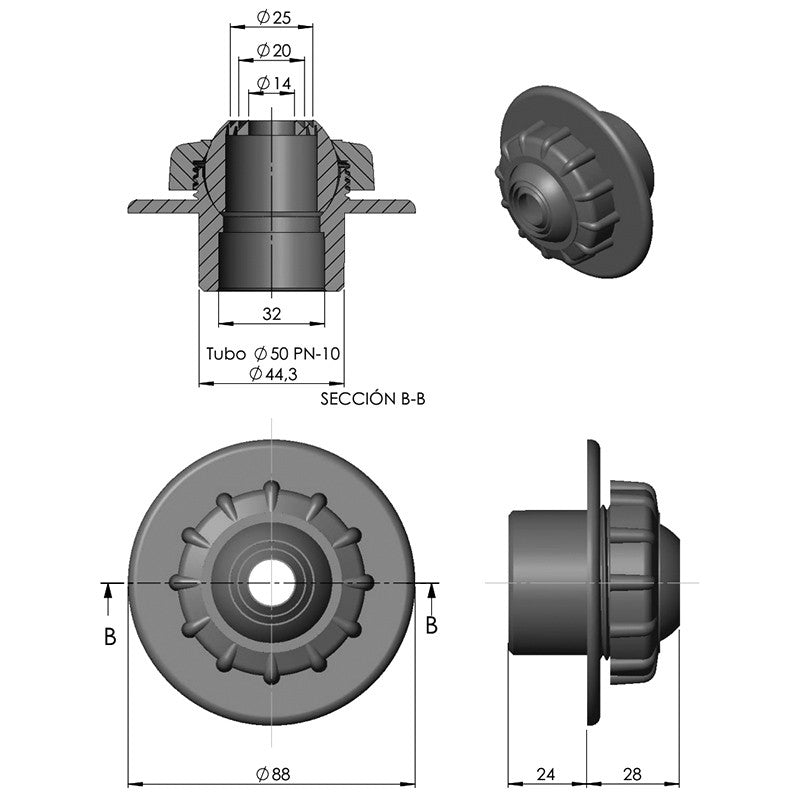 Boquilla de impulsión para encolar en tubo de Ø50 mm PN10 en piscinas de hormigón y con una salida de agua por un rificio de Ø20 mm. Conforme a las normas: EN 16582-1 EN 16713-2