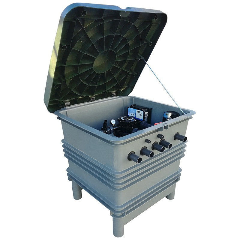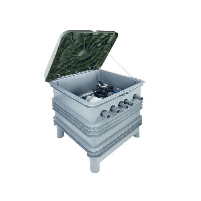 Compacto para ir enterrado para piscina, formado por una caseta inyectada en polímero reforzado con fibra de vidrio y una tapa. En su interior alberga un filtro Aster de Ø 550 mm con válvula FLAT selectora manual TOP y una bomba de recirculación Sena de 1 CV.